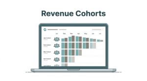 Modern illustration of a SaaS dashboard on a laptop screen showing revenue growth charts with upward arrows, in a minimalist style on a clean office desk with soft natural lighting.