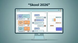 Modern illustration of a checklist on a clipboard next to a launch button on a Skool site interface, with a simple desk setup including calendar and notes.